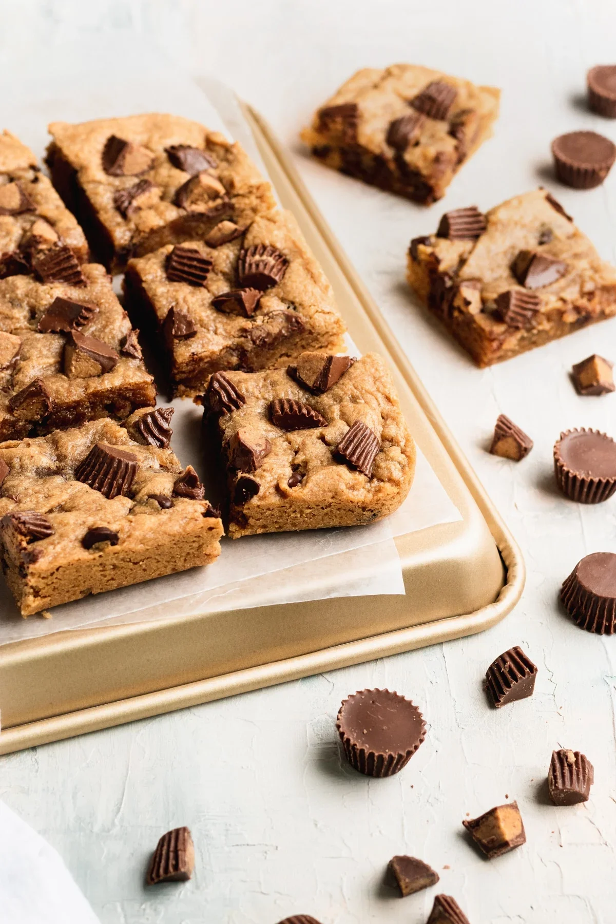 Turn batter into pan and spread evenly. Top with chopped Reese's mini cup pieces over batter.
