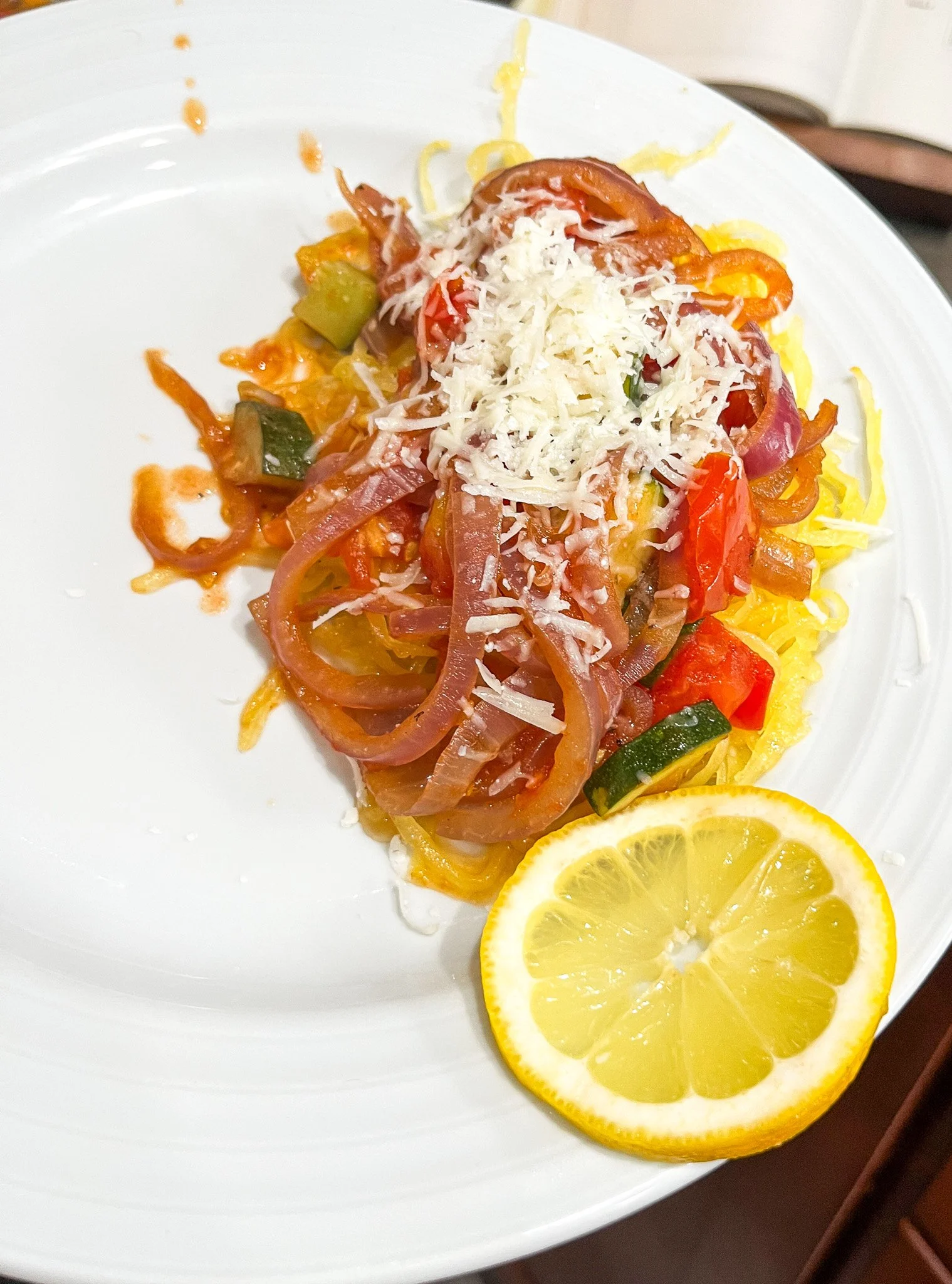 Using a fork, scrape the squash strands into a bowl. Toss with the remaining Tablespoon of oil. Mound the squash in the center of 4 pasta bowls and spoon the vegetable mixture around the squash. Drizzle with more oil, if desired, and garnish with Parmesan cheese, if using. Add the lemon slices on the side.
